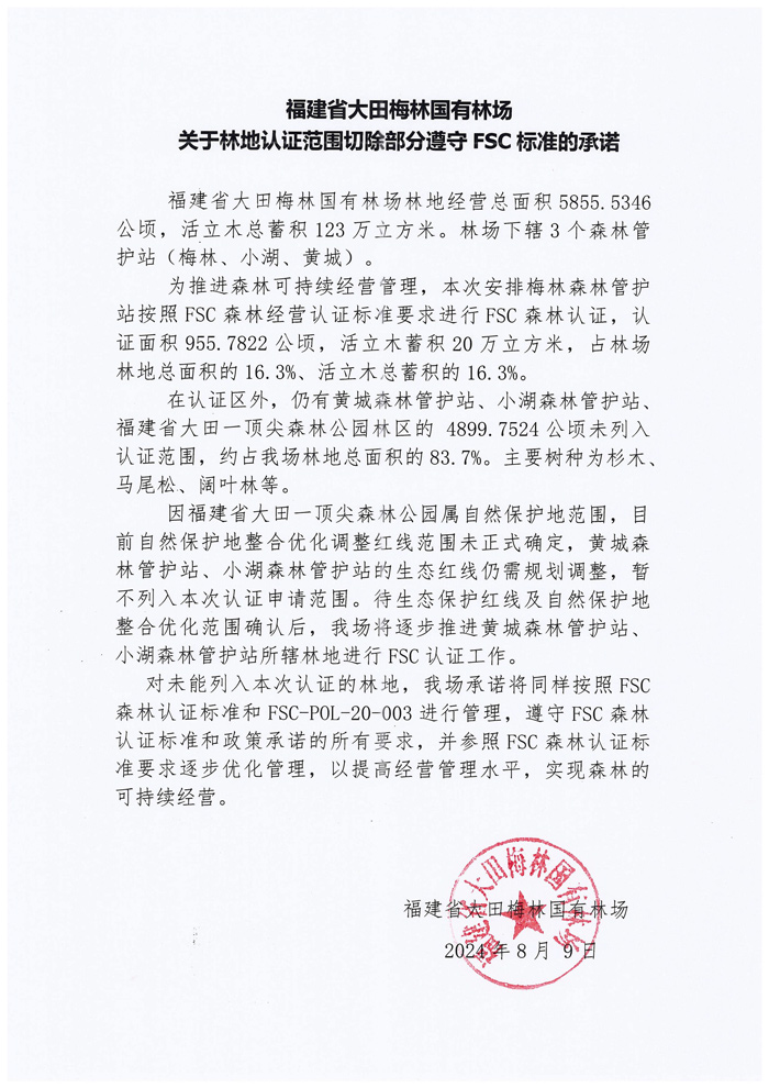 福建省大田梅林国有林场关于林地认证范围切除部分遵守FSC标准的承诺